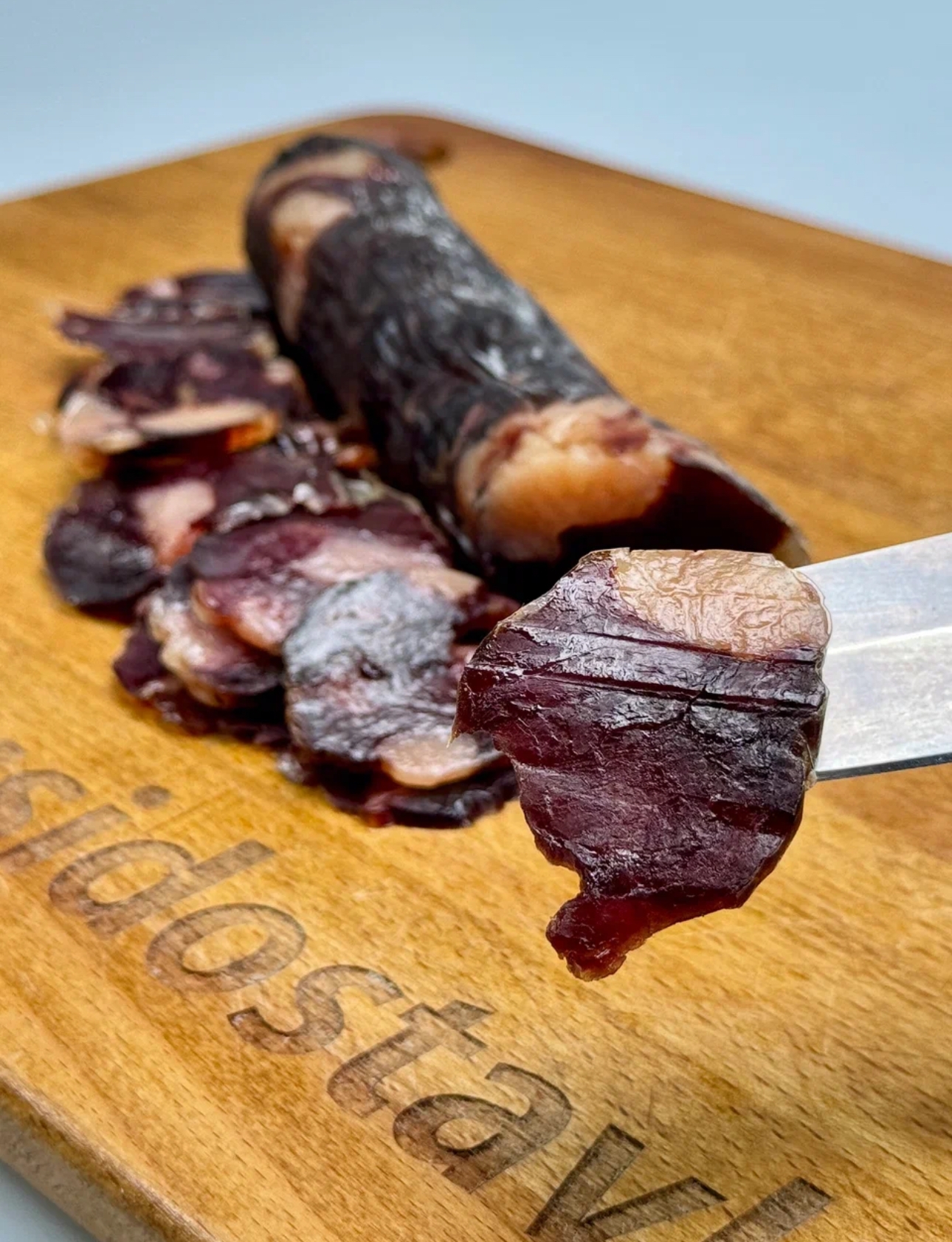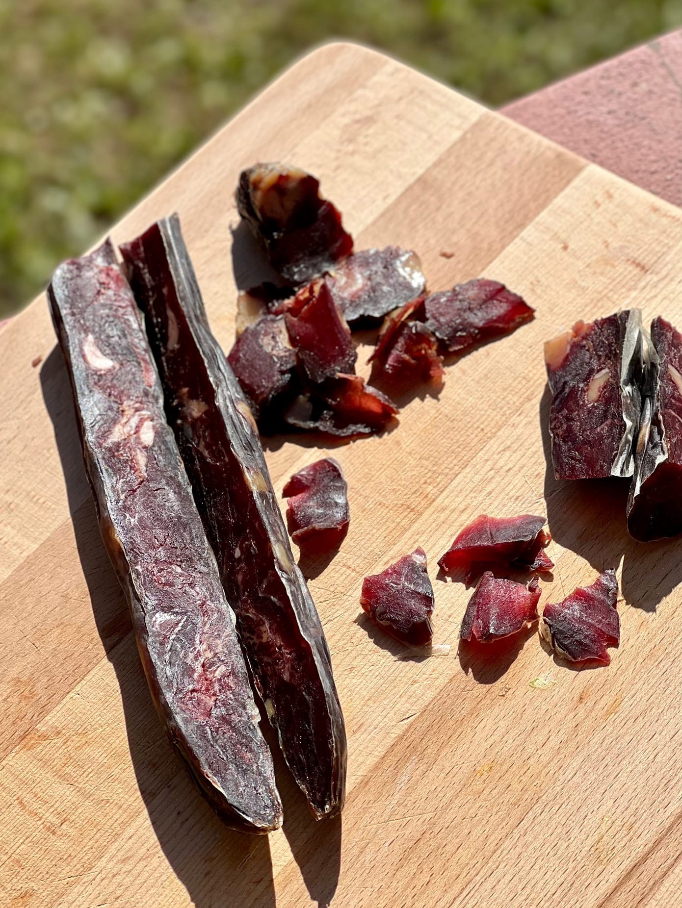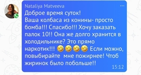 Вес одной палки: 210-230 грамм (чем дольше лежит, тем меньше вес, вяленое мясо усыхает как и должно).